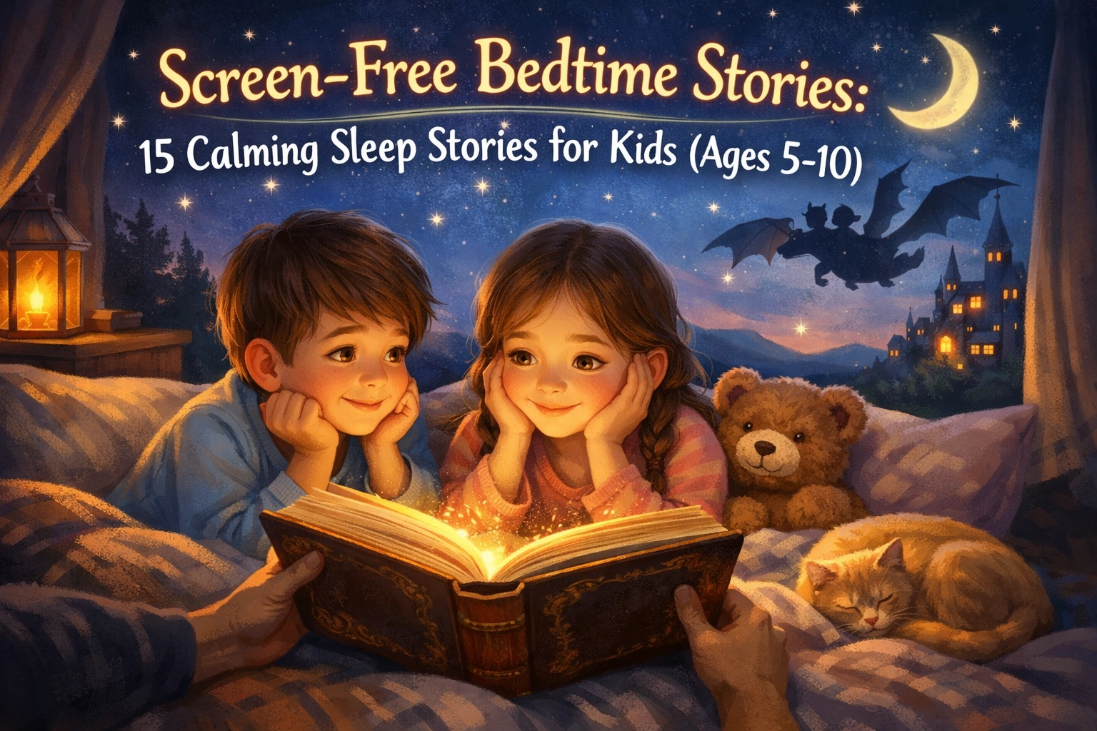 Discover 15 calming screen-free bedtime stories for kids ages 5-10. Help your child wind down naturally with these soothing sleep stories.